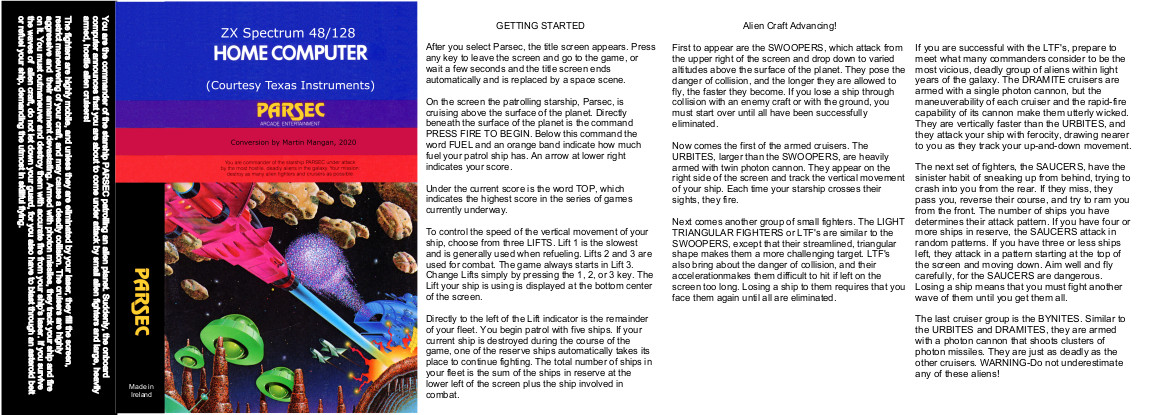 This Spectrum port of Parsec was not developed by Texas Instruments. But it is courtesy of Texas Instruments that I can make it available here.