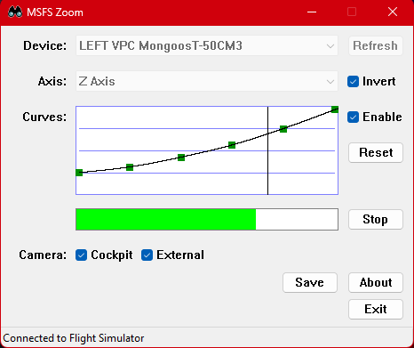 Other flight simulators allow the use of an axis such that the absolute position of the axis defines the absolute zoom level. This application replicates that behaviour in Microsoft Flight Simulator.