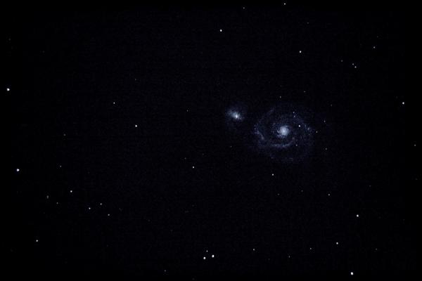 If you squint just right, you can see there might be something there. I stuck a camera on the end of the telescope, pointed the telescope to where M51 was supposed to be, and took a picture. It's not a good image, but it's my first deep space image. I was delighted. And I'm still proud of it.